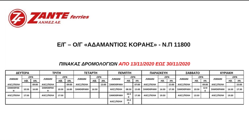 Από αύριο 13 Νοεμβρίου επιστρέφει στις δρομολογιακές του υποχρεώσεις στη γραμμή Αλεξανδρούπολη – Σαμοθράκη, το Ε/Γ-Ο/Γ Αδαμάντιος Κοραής.